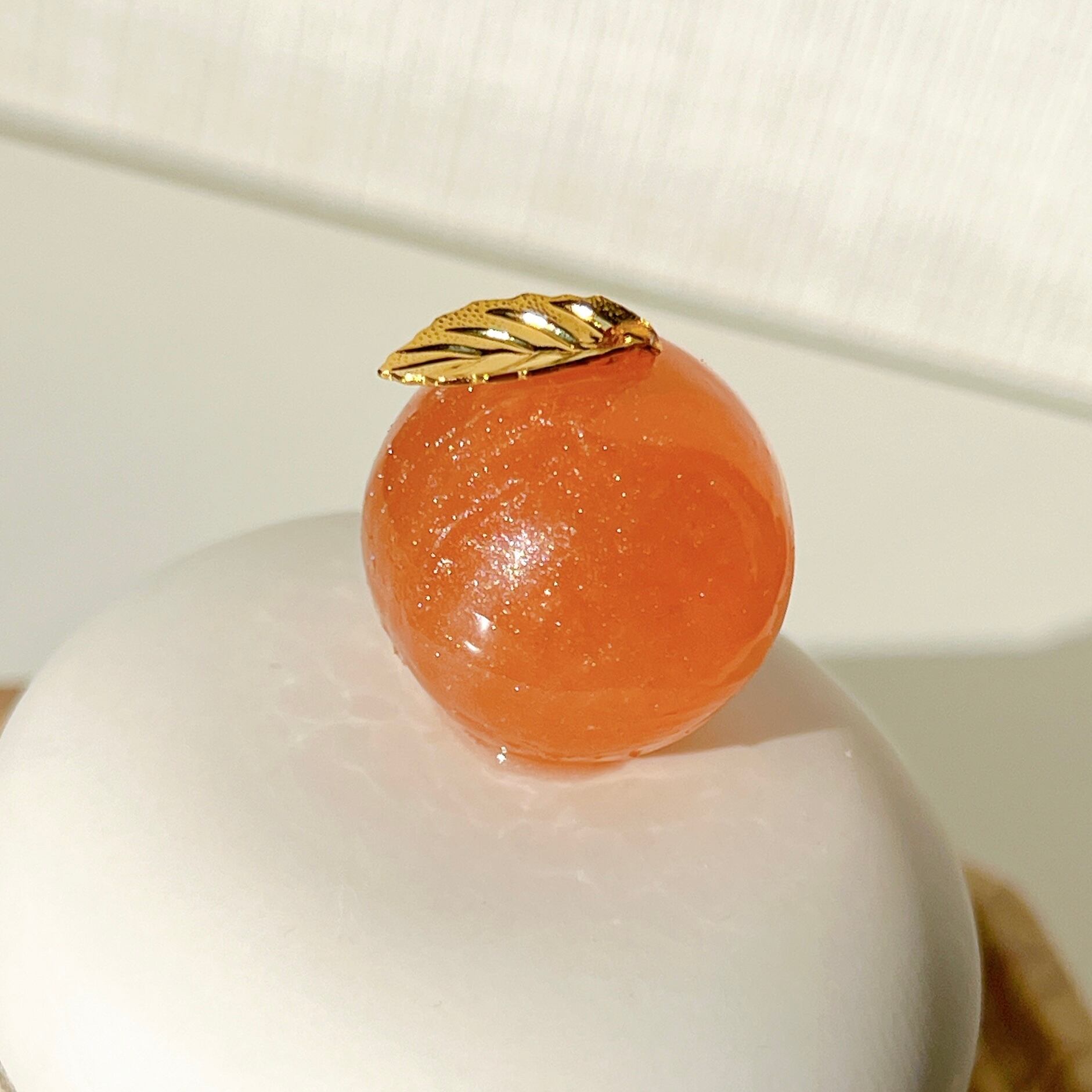 ちょこんと乗ったみかんは、ちゅるんとした質感の中にオーロラパウダーが入っているので、キラキラと輝きます。