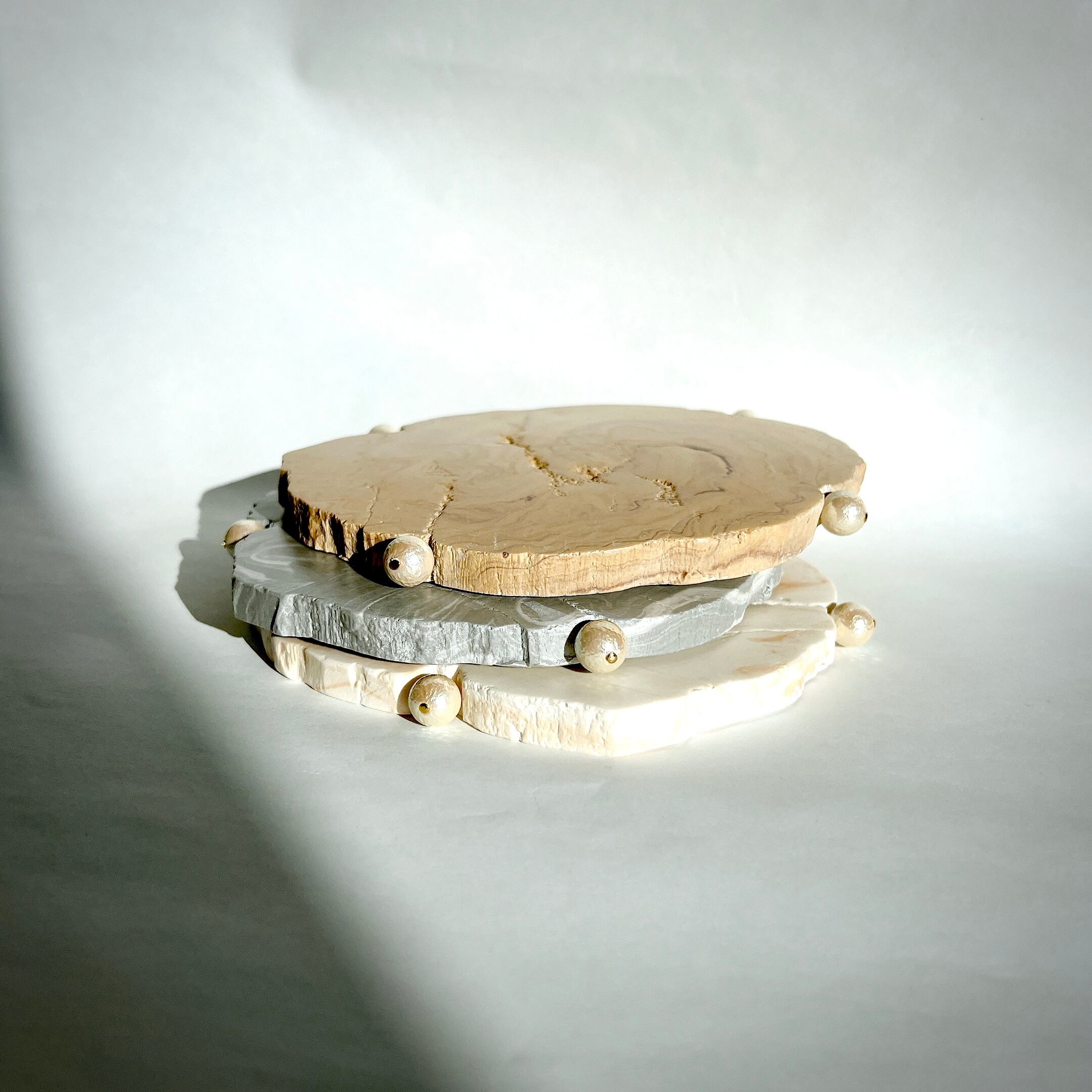 ジェスモナイトとは…【水性アクリル樹脂からなる複合か造形素材です。有機溶剤(VOC)不使用で人体にも環境にも優しいサスティナブルな材料です。陶器のような、サラッとした、高級感のある素材です。】